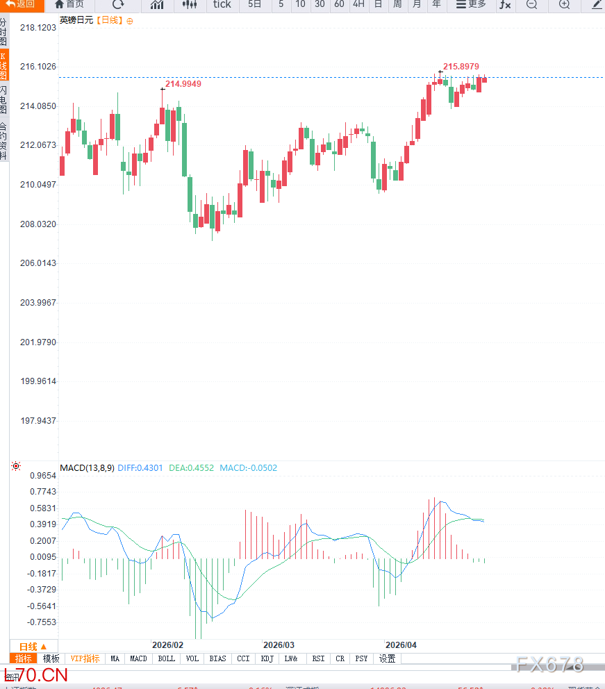 从技术面来看,日线级别上,GBP/JPY维持高位运行格局,整体趋势仍偏多,价格沿上升通道运行,但短期动能有所放缓。当前关键支撑位位于213.80附近,若跌破可能回落至212.50区域;上方阻力位集中在216.50至218.00区间,该区域为前期高点附近压力区。动能指标显示多头仍占主导,但上涨斜率趋缓。4小时级别来看,汇价呈现震荡上行结构,短期均线维持多头排列,但多次冲高未能有效突破216.00上方,表明上方存在较强抛压。若后续突破216.50,则有望打开进一步上行空间;反之,若跌破213.80,则可能进入阶段性调整。