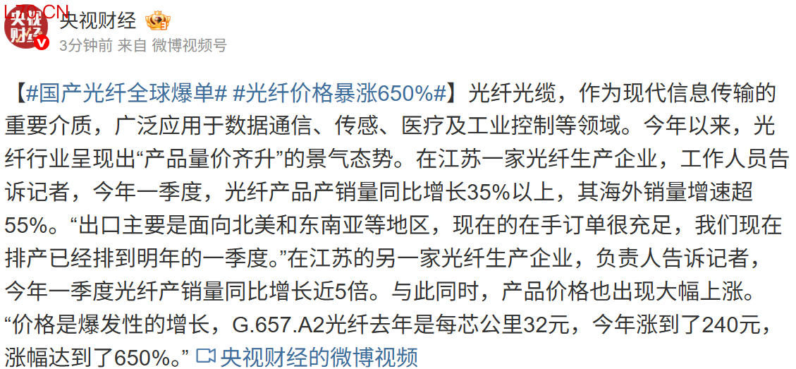 国产光纤全球爆单 部分产品价格暴涨650%
