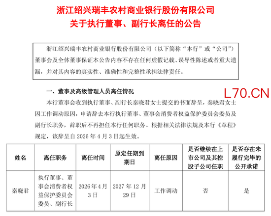 瑞丰银行近日公告,因工作调动原因,秦晓君申请辞去该行执行董事、董事会消费者权益保护委员会委员及副行长职务,辞职后不再担任该行任何职务。