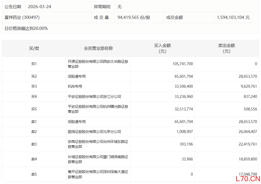 富祥药业今日20%涨停,开源证券西安太华路证券营业部净买入1.06亿元