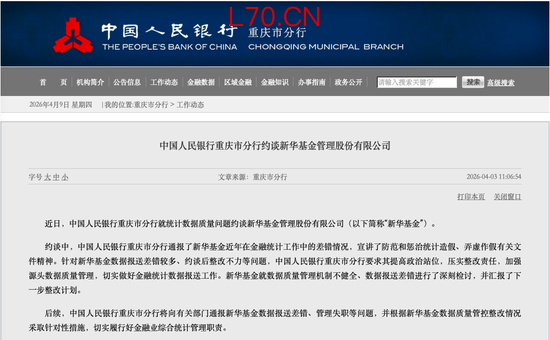 近日,央行重庆分行发布公告称约谈了新华基金。约谈中,该行通报了新华基金近年在金融统计工作中的差错情况,宣讲了防范和惩治统计造假、弄虚作假有关文件精神。针对数据报送差错较多、约谈后整改不力等问题,该行要求新华基金提高政治站位,压实整改责任,加强源头数据质量管理,切实做好金融统计数据报送工作。