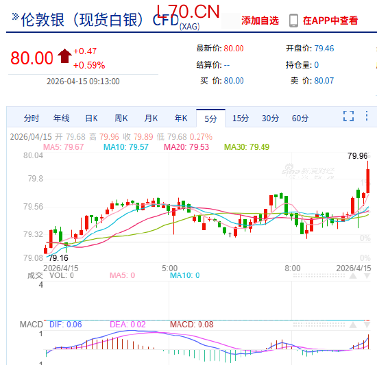 快讯:现货白银向上触及80美元/盎司,为3月18日以来首次,日内涨0.58%